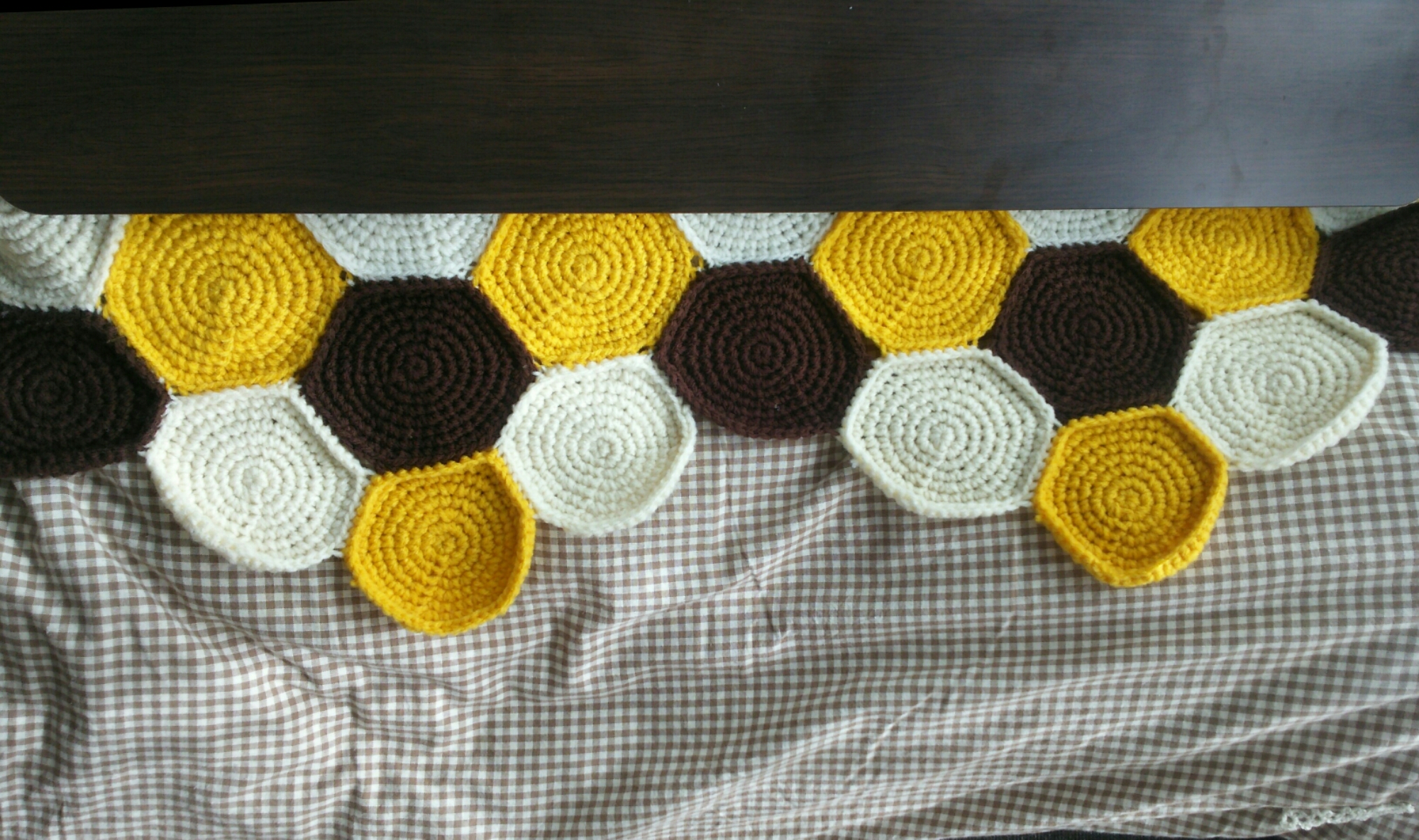 このこたつカバーは六角形をつなげて作っているので、カバーの4辺のうちの2辺はなみなみした感じになります。私は完成が近付いてきたときに毛糸が足りなくなってしまって、でも買い足すのも面倒くさかったので、あえてよりなみなみさせてみました。